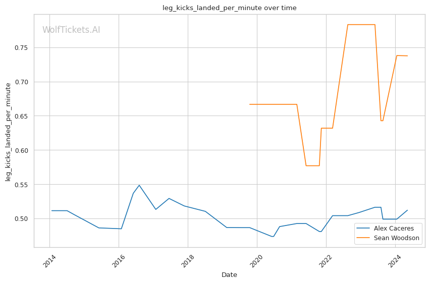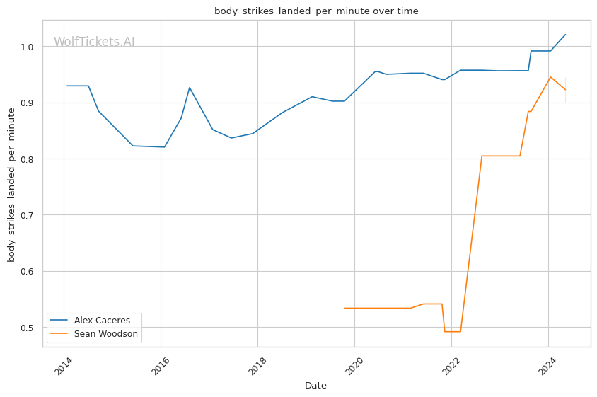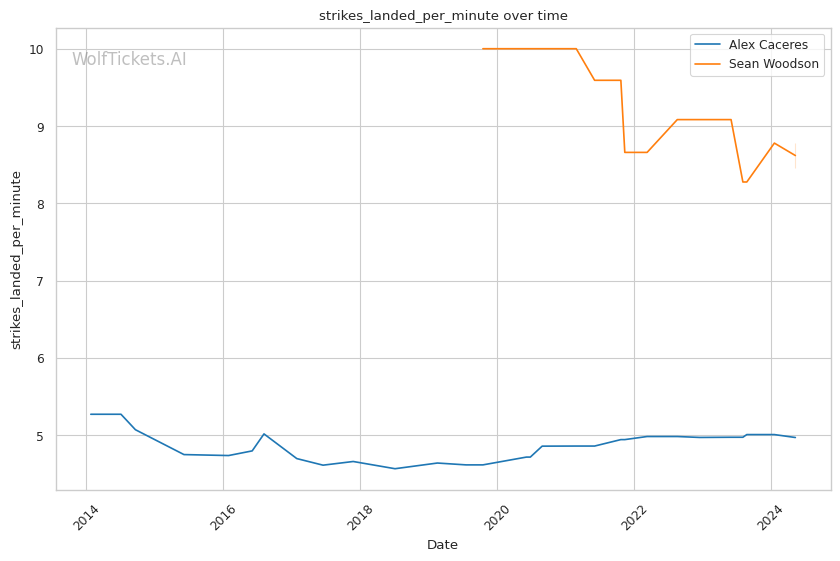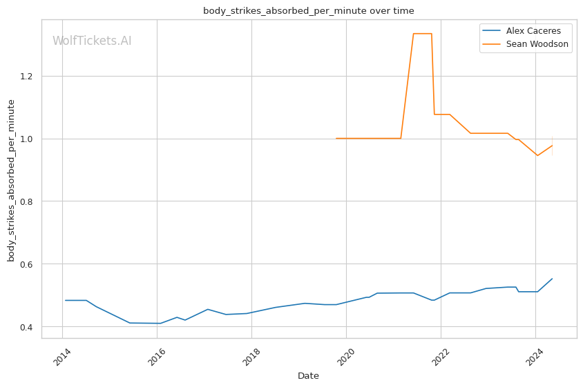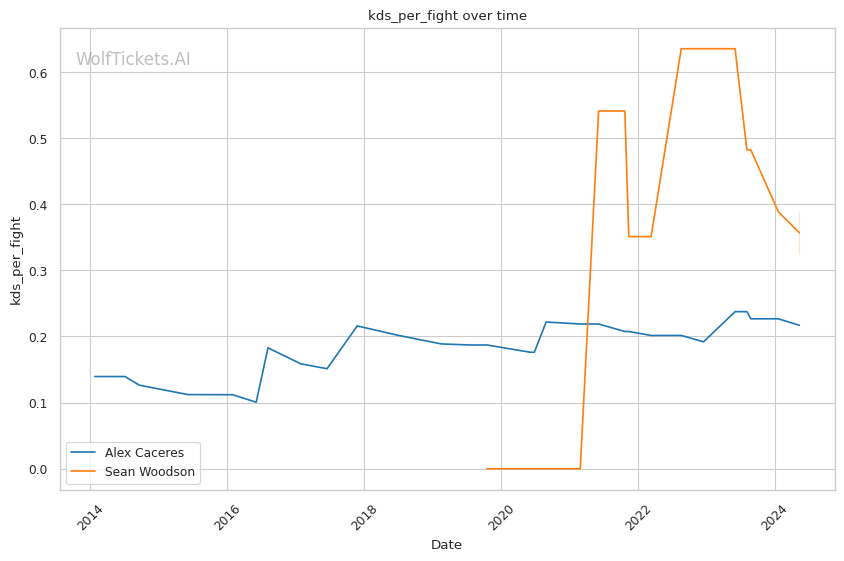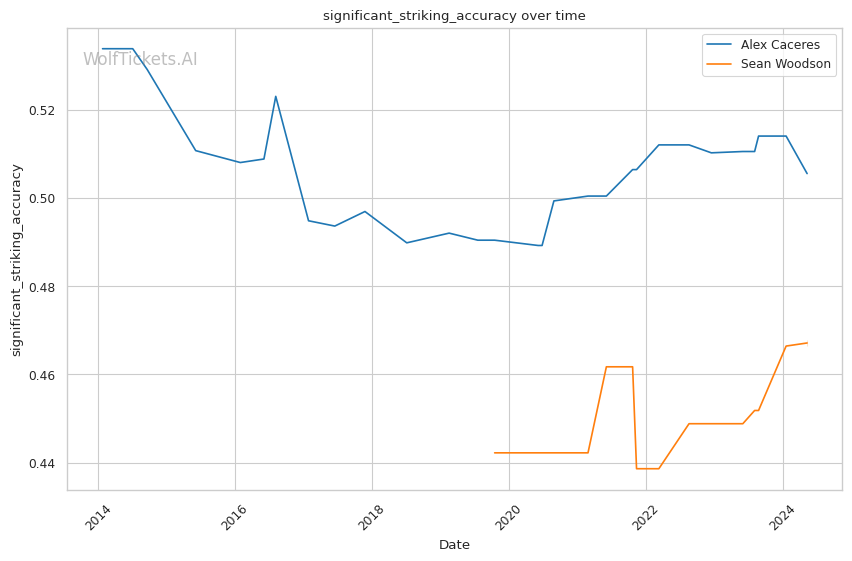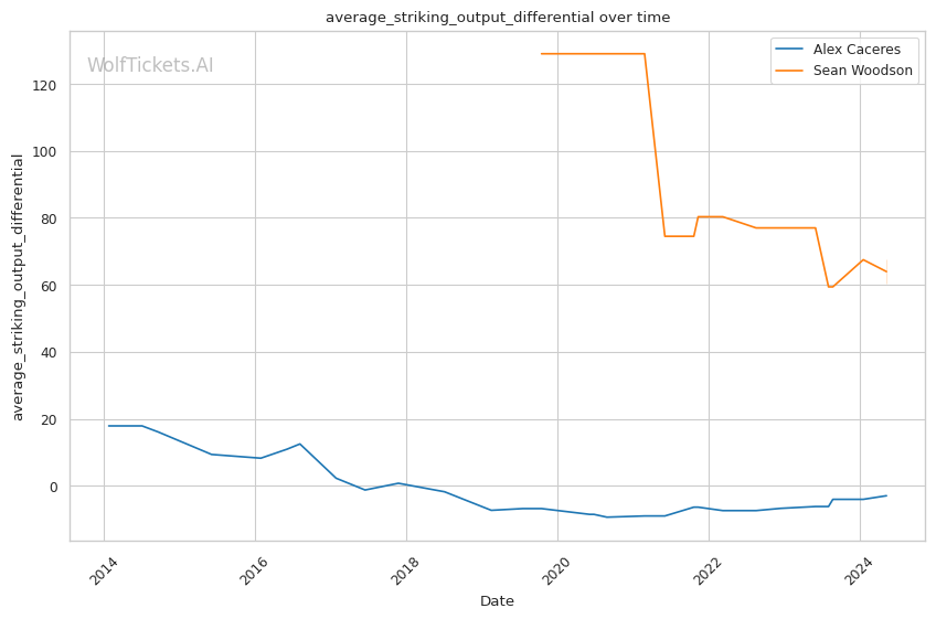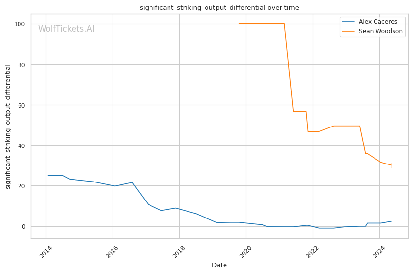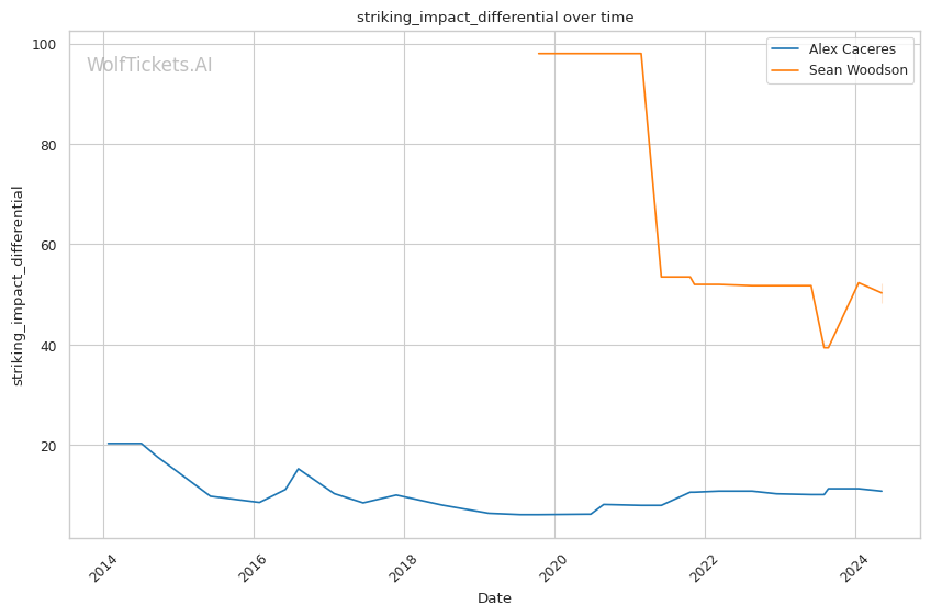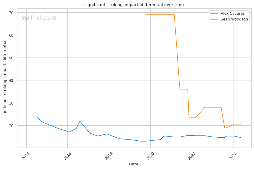 Recent Striking Impact Differential: Woodson lands 21.90 more significant strikes than he absorbs per minute in his recent fights, compared to 16.26 for Caceres. This higher differential for Woodson increases his chances in the model.
