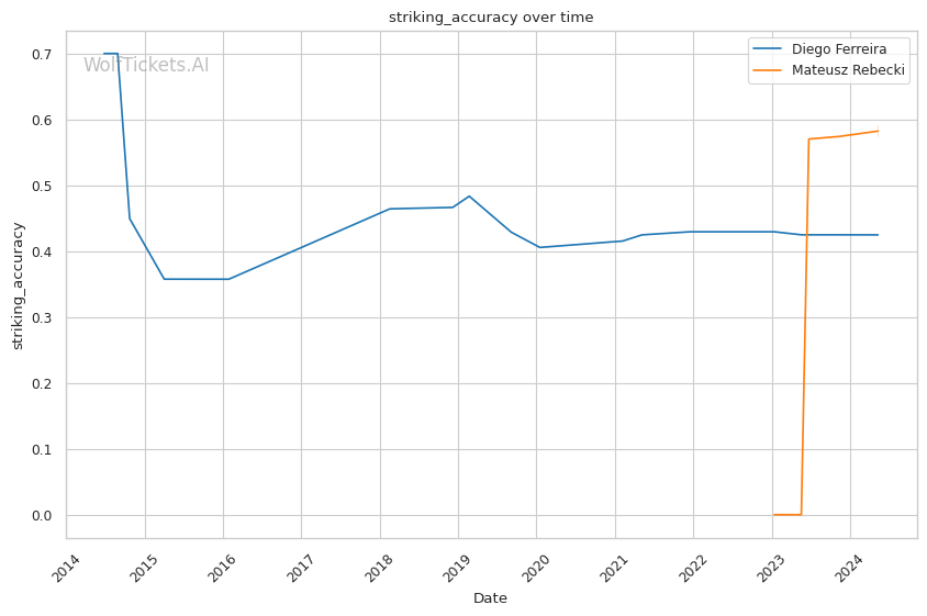 Striking Defense Percentage: Ferreira's weak 52.79% striking defense compared to Rebecki's solid 56.98% decreased the score by 1 point.