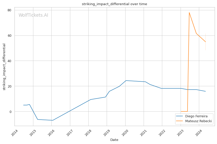 Significant Striking Impact Differential: Ferreira's 11.14 differential is much lower than Rebecki's 32.67, decreasing the score by 1 point.