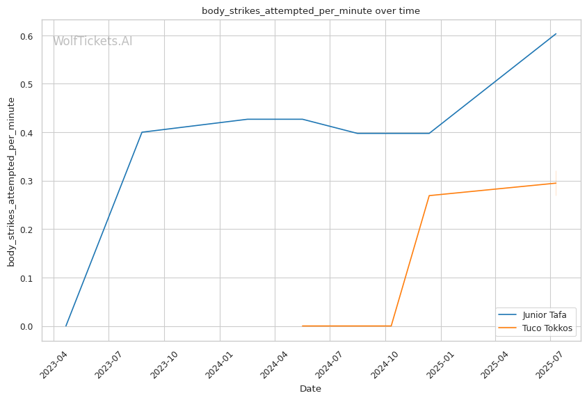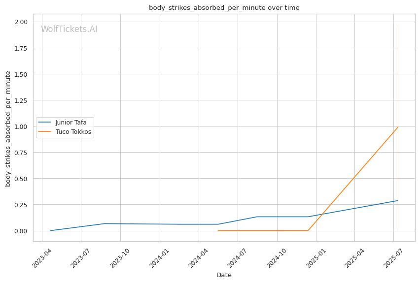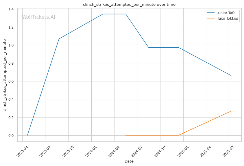 Tokkos's striking game centers around setting up his wrestling, landing 1.87 significant strikes per minute with moderate accuracy. His leg kick game shows promise, landing 0.59 per minute, which could be crucial against Tafa's known vulnerability to calf kicks. His body strike absorption rate of 1.98 per minute indicates he's willing to absorb punishment to close distance for takedowns.