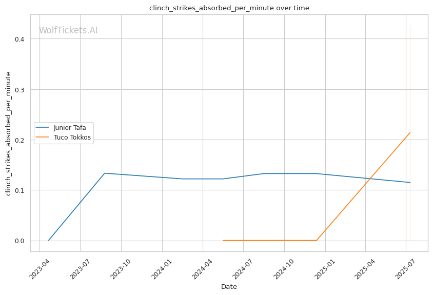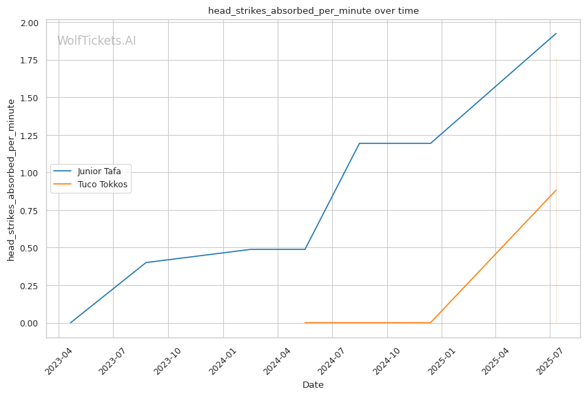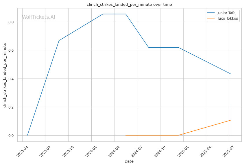 Tafa's power punching poses serious problems for Tokkos's approach. With Tokkos absorbing 1.76 head strikes per minute and showing poor striking defense, Tafa's overhand right and left hook combinations could find their mark as Tokkos closes distance. The key technical battle will be whether Tokkos can survive the initial striking exchanges to implement his grappling game.