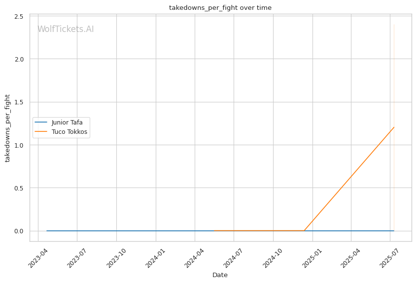 Tafa's explosive power and Tokkos's declining recent form create a clear technical mismatch. While Tokkos's grappling approach theoretically exploits Tafa's biggest weakness, his poor recent execution and striking defense make him vulnerable to Tafa's knockout power. WolfTicketsAI's prediction of a Tafa victory reflects the significant gap in finishing ability and recent performance between these fighters.
