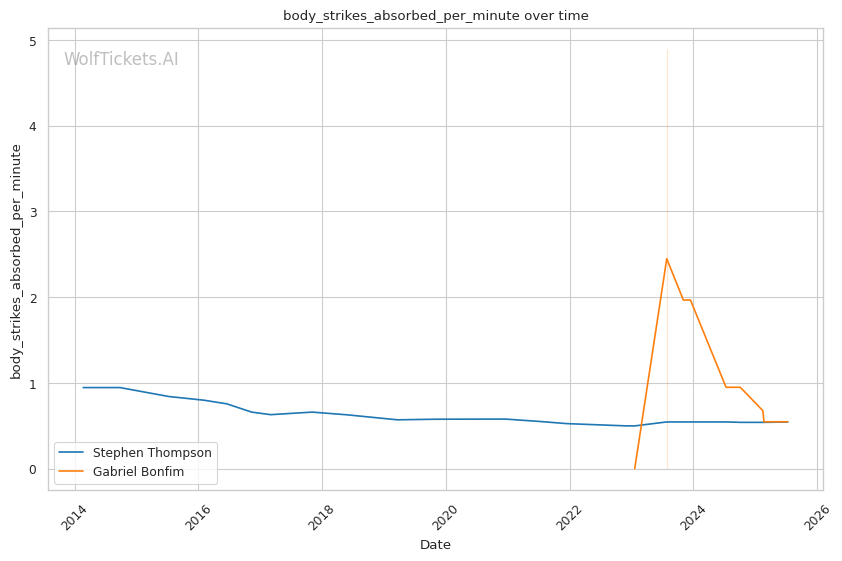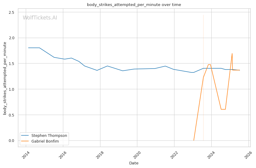 Conversely, Thompson's technical striking could find openings during Bonfim's overextended entries. Thompson's sidekick to the body might be particularly effective against Bonfim's forward pressure, potentially disrupting his rhythm and cardio. However, Thompson's declining lateral movement makes it difficult for him to maintain the distance necessary to utilize this weapon consistently.