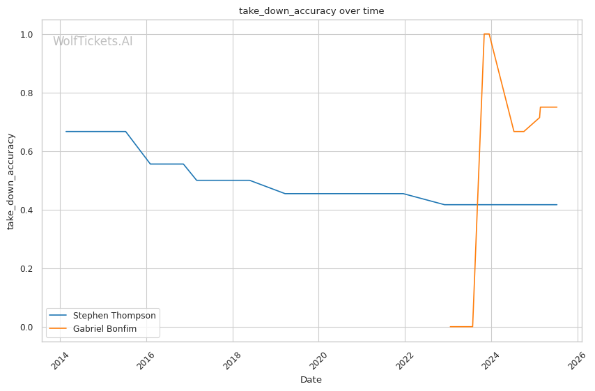 Thompson's sliding counter right hand, while still accurate, becomes less effective against opponents willing to absorb shots to close distance - exactly Bonfim's approach. Bonfim's diving takedown entries could exploit Thompson's static positioning after landing counters, as Thompson now remains stationary long enough for aggressive opponents to crash into him.