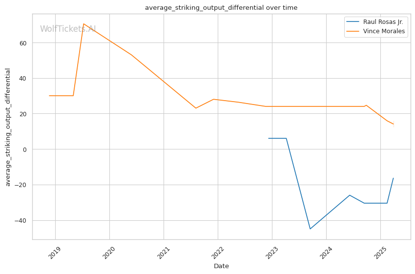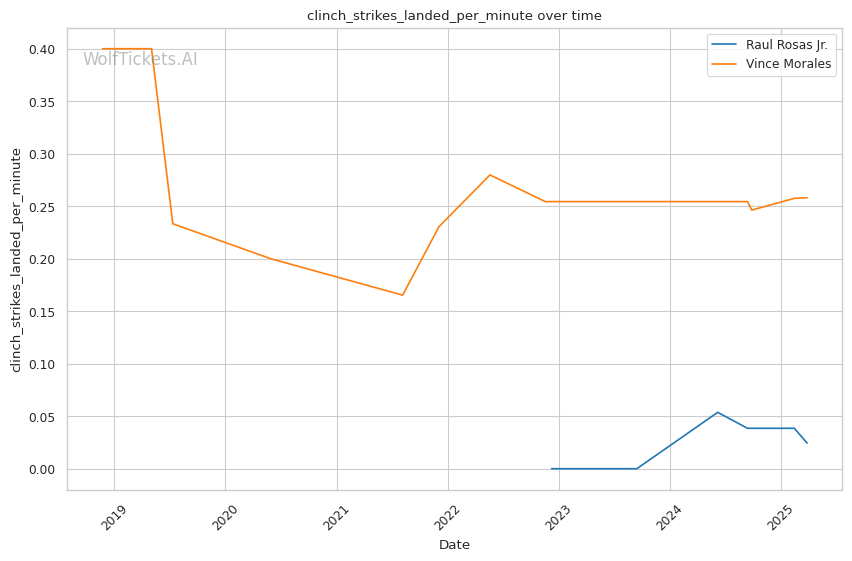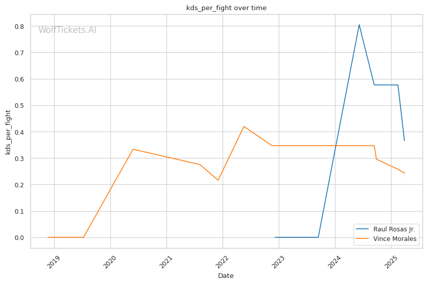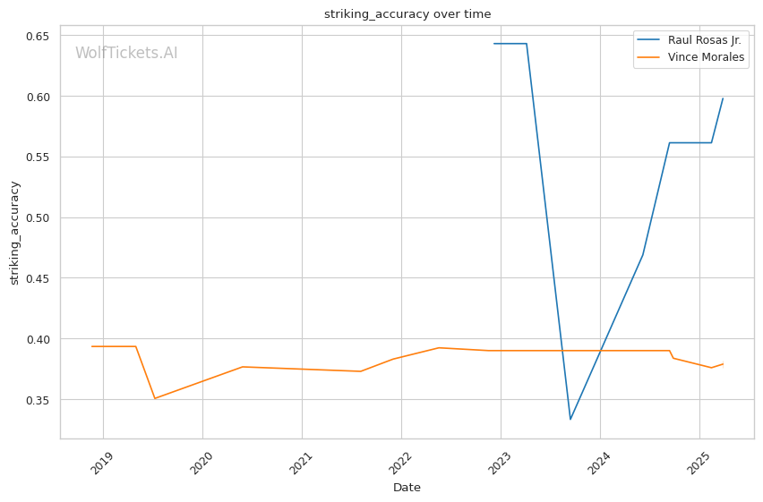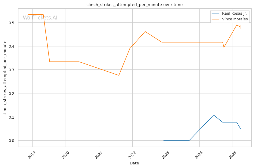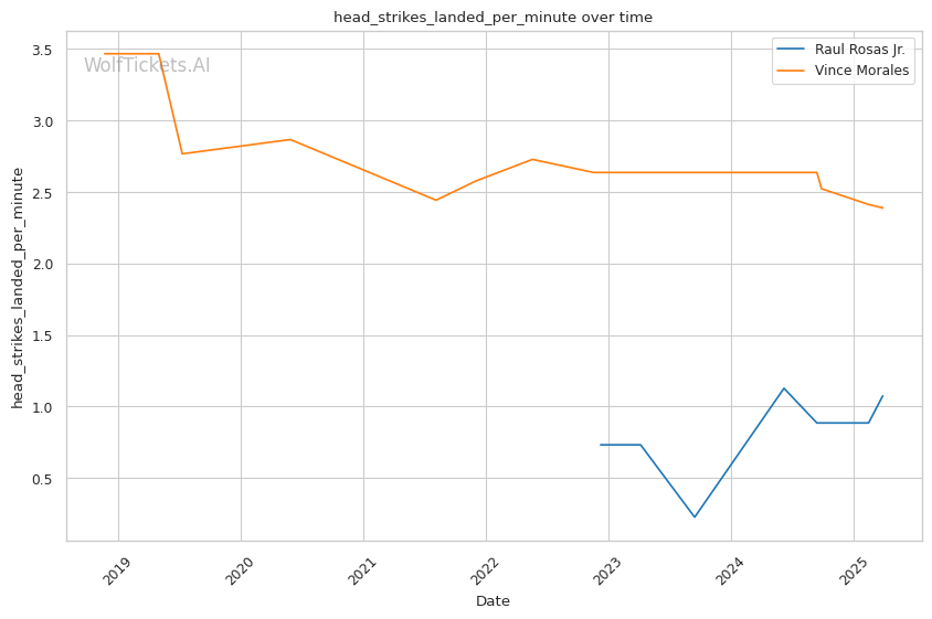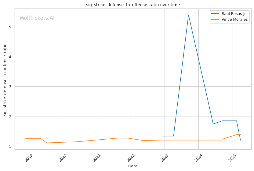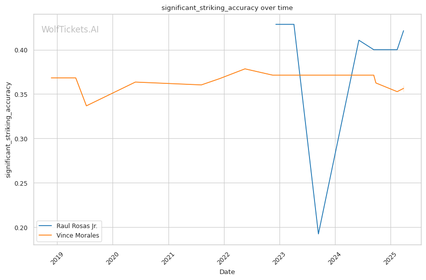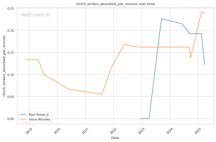 Striking Defense: Despite his youth, Rosas has shown improved striking defense (54% significant strike defense) compared to Morales's declining defensive metrics (dropping from 52% to 48% recently).