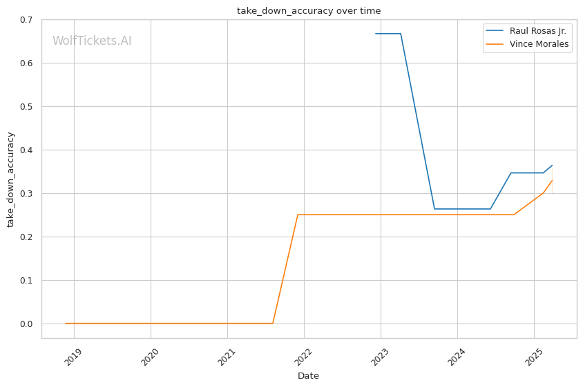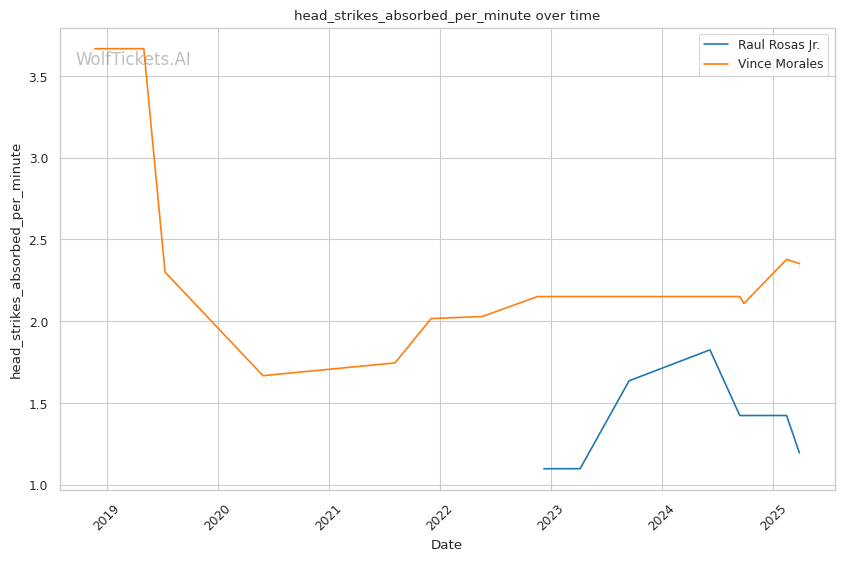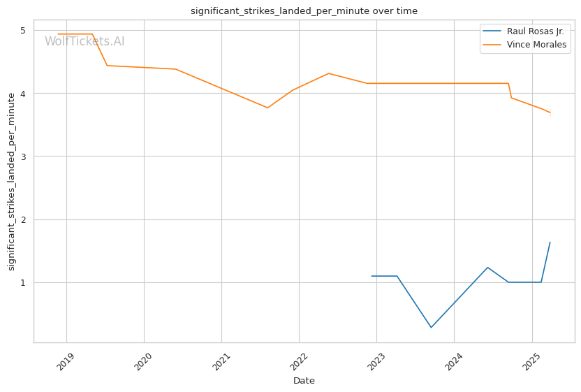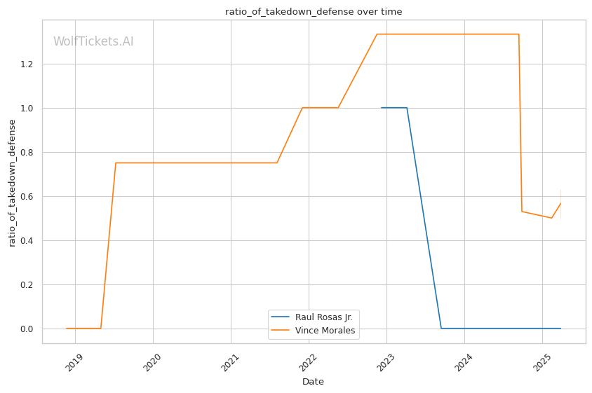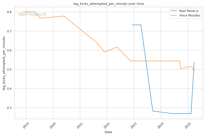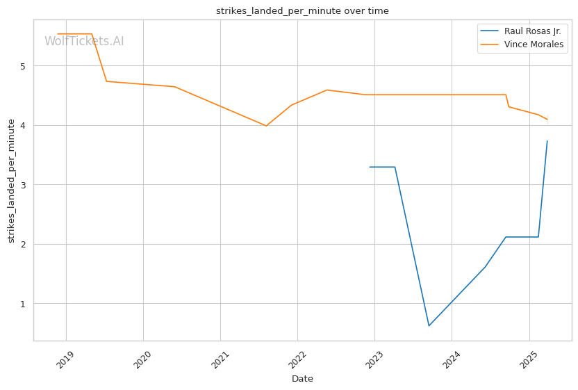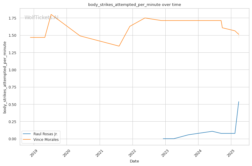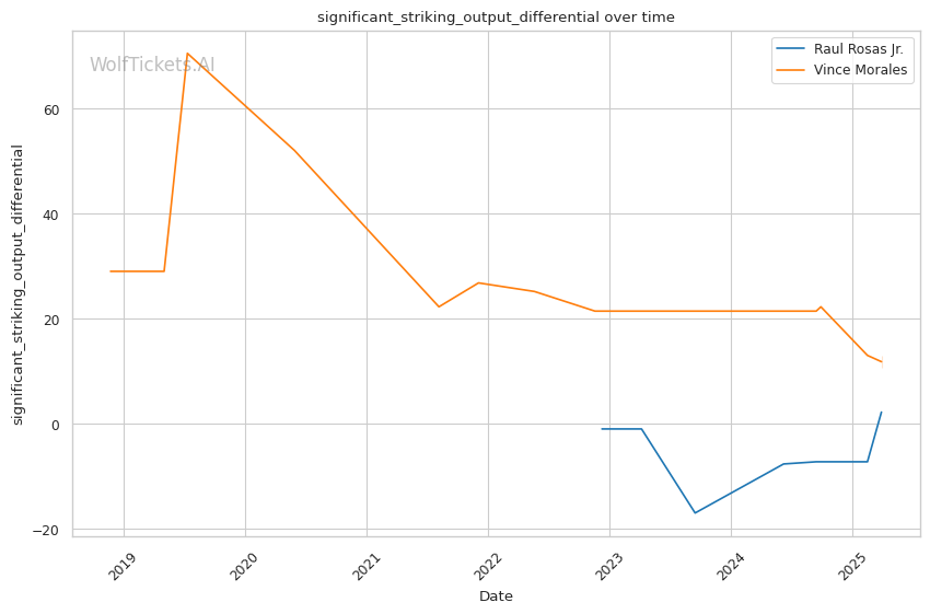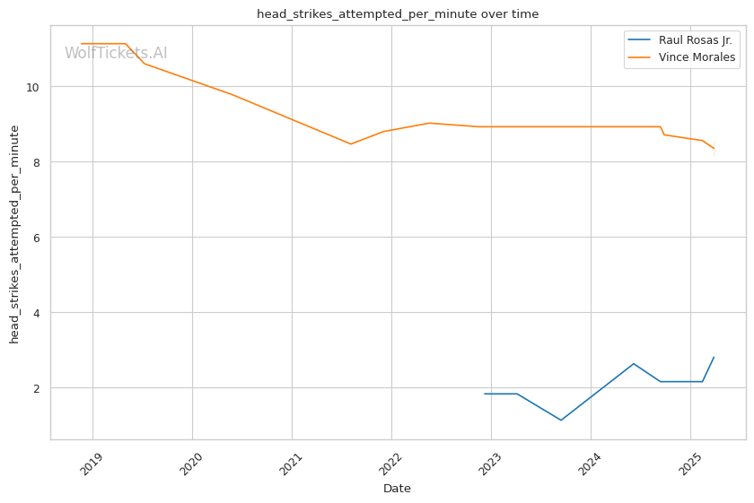 Striking Defense: Despite his youth, Rosas has shown improved striking defense (54% significant strike defense) compared to Morales's declining defensive metrics (dropping from 52% to 48% recently).