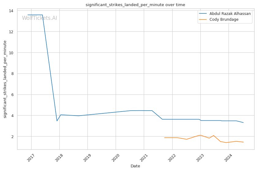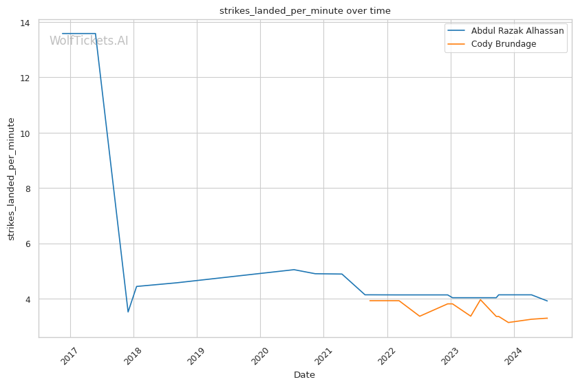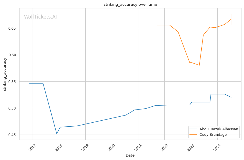 Brundage has shown the ability to finish fights both on the feet and on the ground. His recent KO/TKO victory over Zach Reese demonstrated his improving striking game, while his submission win against Dalcha Lungiambula highlighted his grappling skills. However, Brundage's striking defense percentage of 32.91% raises concerns about his ability to avoid Alhassan's power shots.