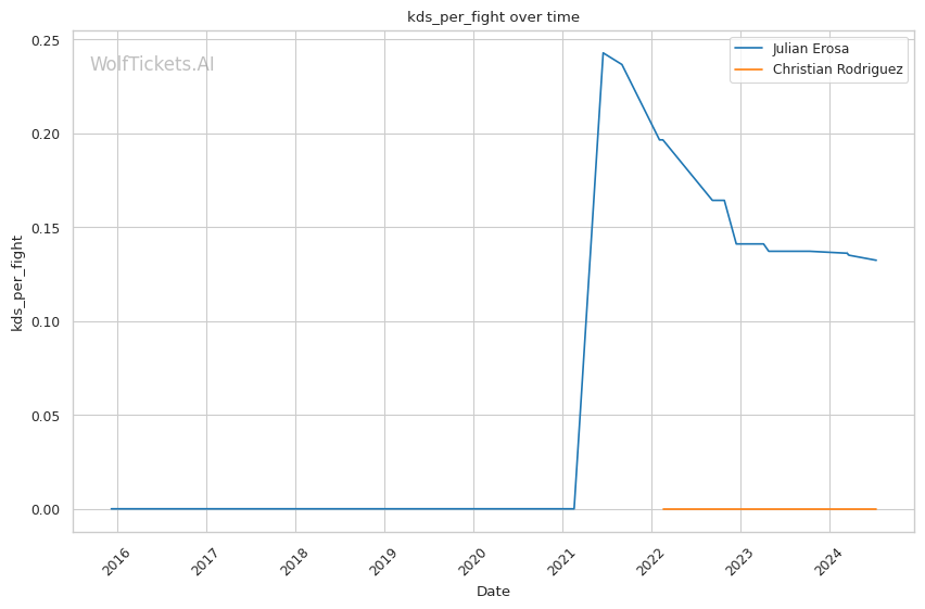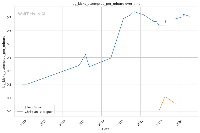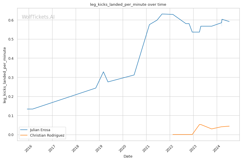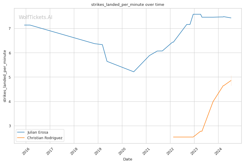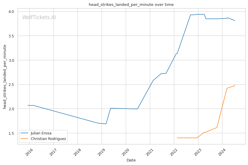 Erosa's striking output is impressive, landing 7.42 strikes per minute with 53% accuracy. His ability to mix up attacks is notable, with a good distribution of head, body, and leg strikes. However, absorbing 4.59 head strikes per minute is concerning given recent KO losses.