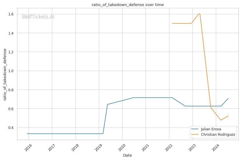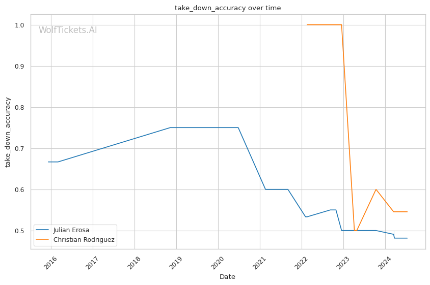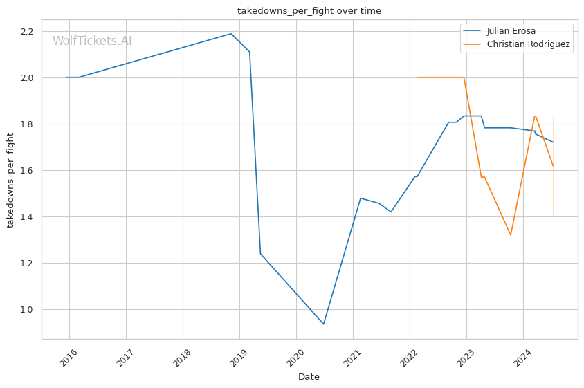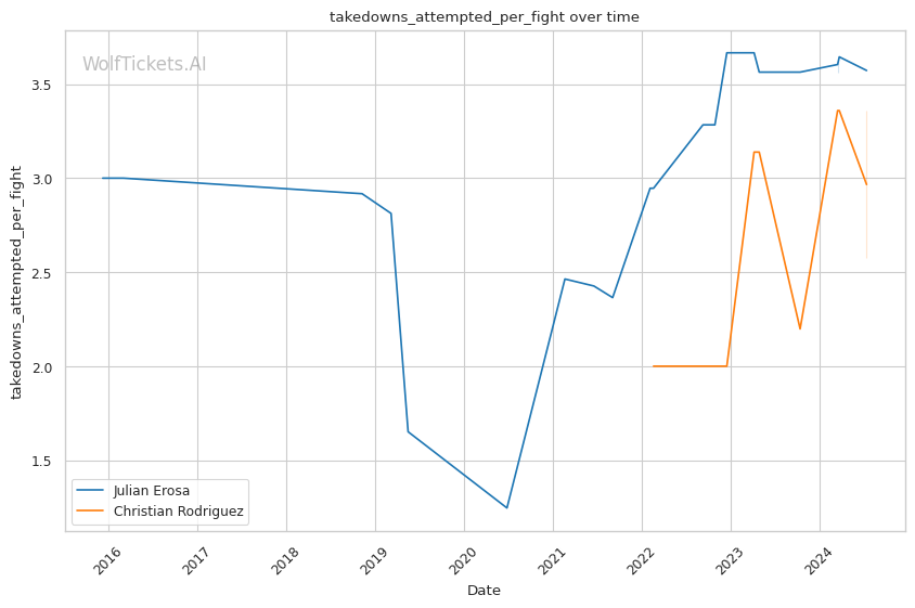 Rodriguez's striking defense is superior to Erosa's, absorbing only 1.17 head strikes per minute. His takedown game is noteworthy, averaging 1.4 takedowns per fight with 54.55% accuracy. Recent improvements in striking, particularly his head kicks, add another dimension to his offense.