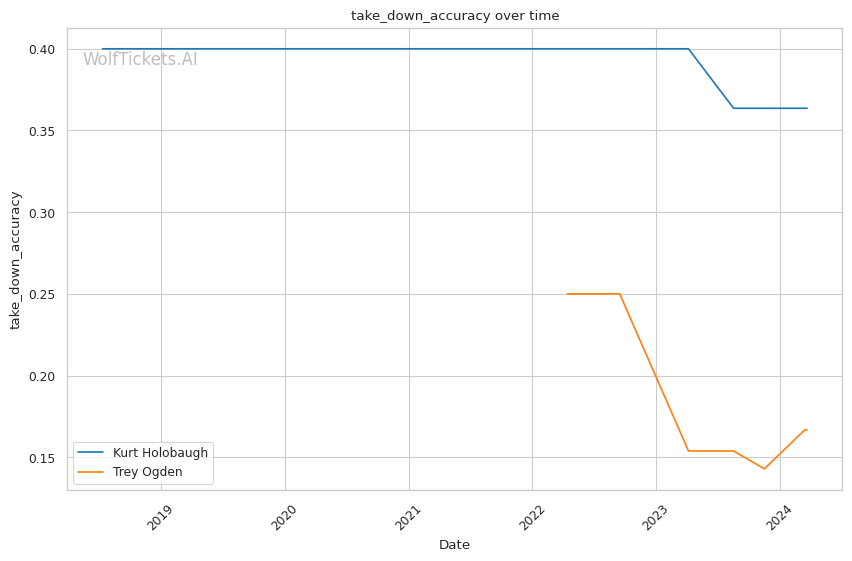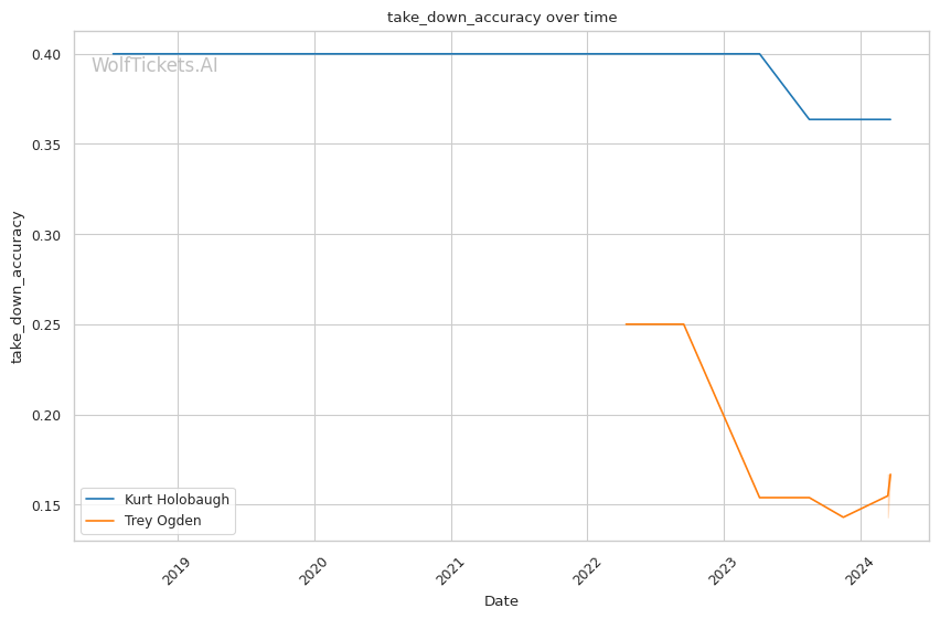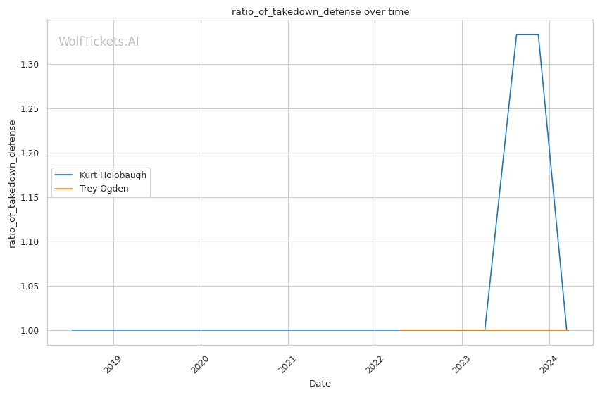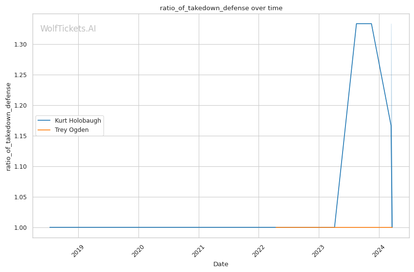 Ogden lands 3.64 significant strikes per minute at 47% accuracy, while absorbing very little in return. His striking defense is solid at 58%. While he attempts a lot of takedowns (7.73 per fight), his success rate is low at just 17%.