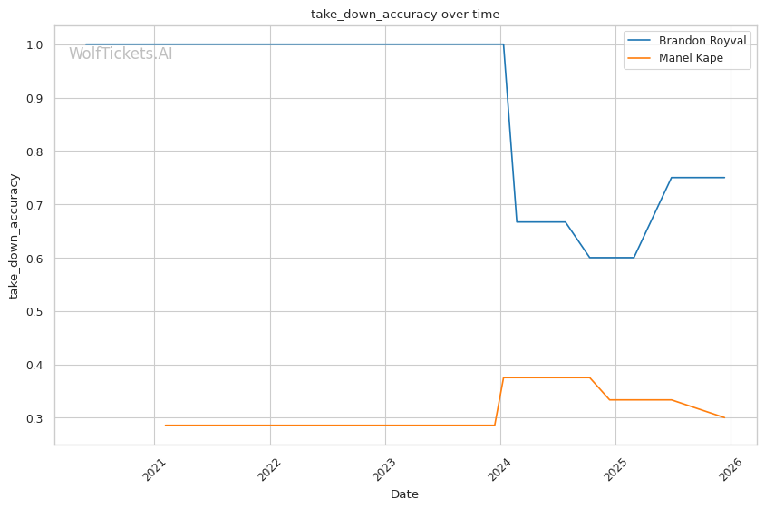 WolfTicketsAI has a mixed record with Royval—correctly predicting his loss to Van and win over Schnell, but missing on his upset wins over Taira and Moreno. The model has been wrong when Royval pulls off chaotic upsets.