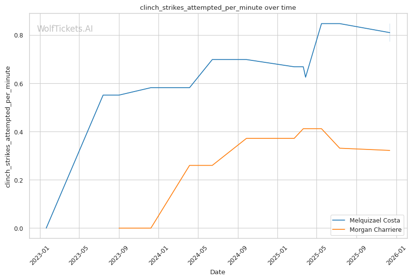 Charriere's calf kicks could target Costa's lead leg and limit his mobility. His counter left hook during transitions could catch Costa when exiting clinch exchanges. However, Charriere's tendency to reduce output under pressure is concerning against a fighter like Costa who will constantly threaten grappling.