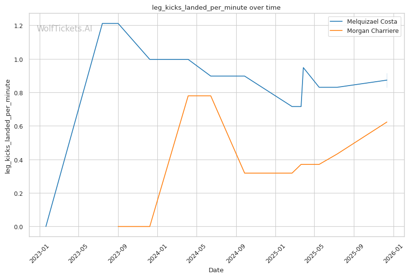 Expect Costa to establish his body kicks from southpaw while looking for clinch entries. Charriere will likely try to keep distance with calf kicks and jabs. If Costa can get to the cage and threaten judo, we could see early grappling exchanges. Charriere's output may be high initially, but Costa's pressure could reduce it as the round progresses.