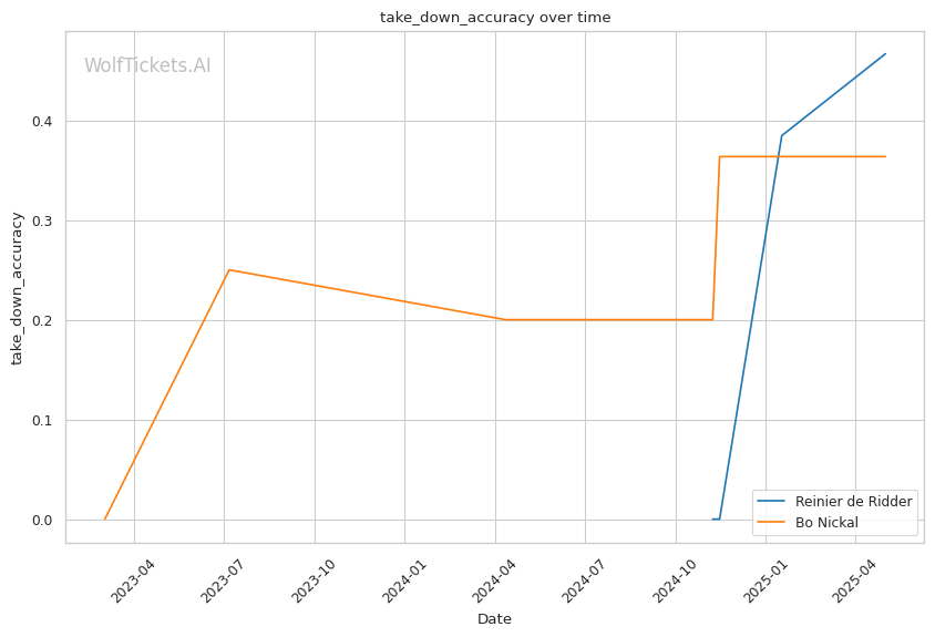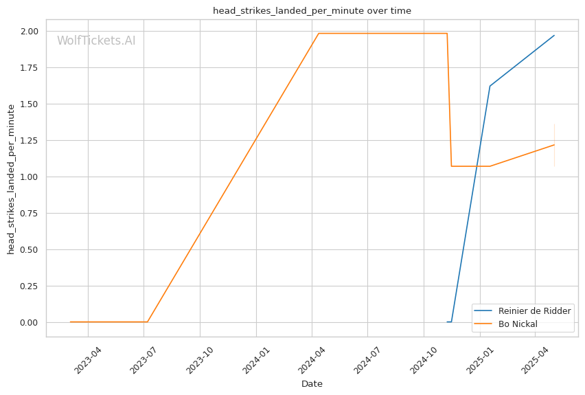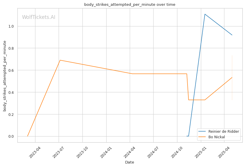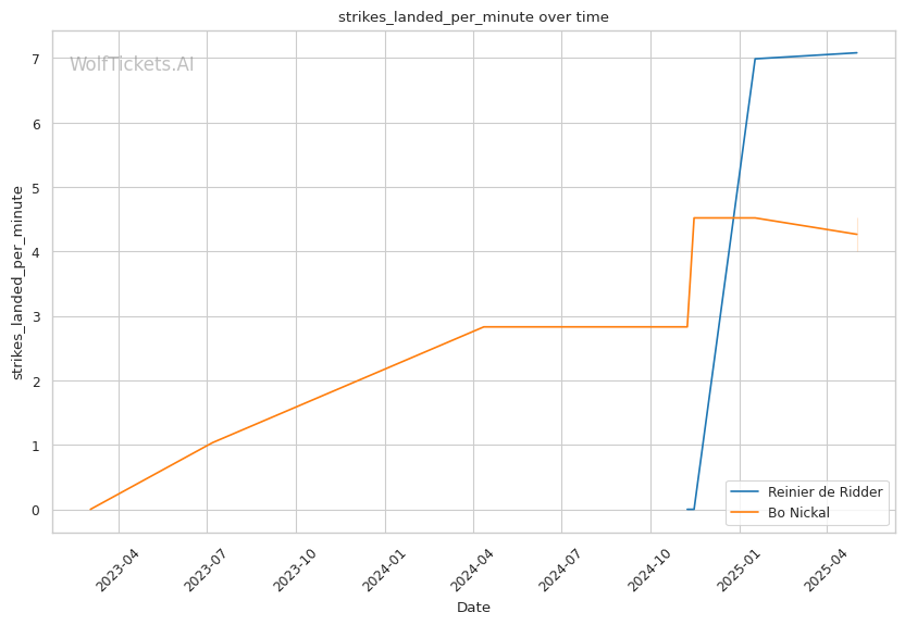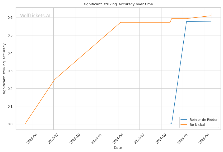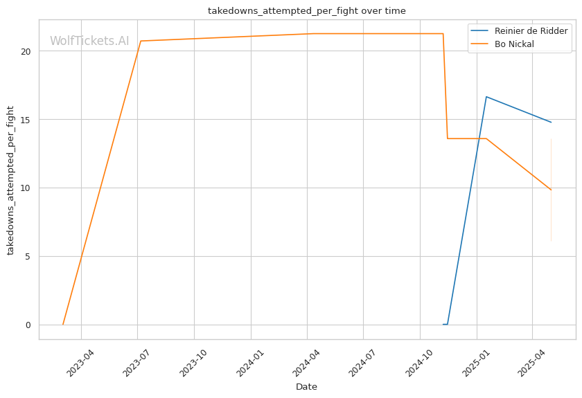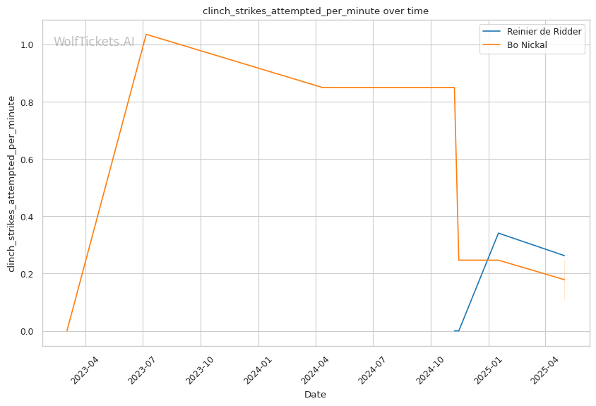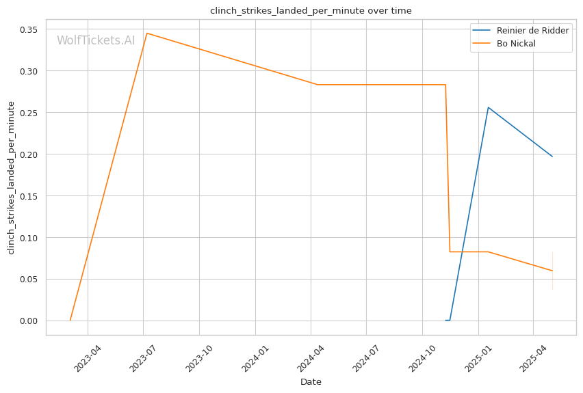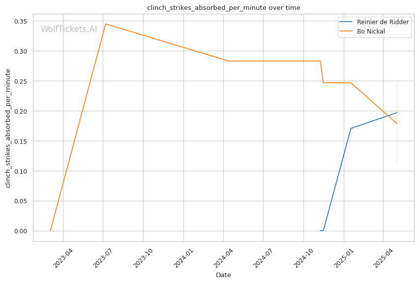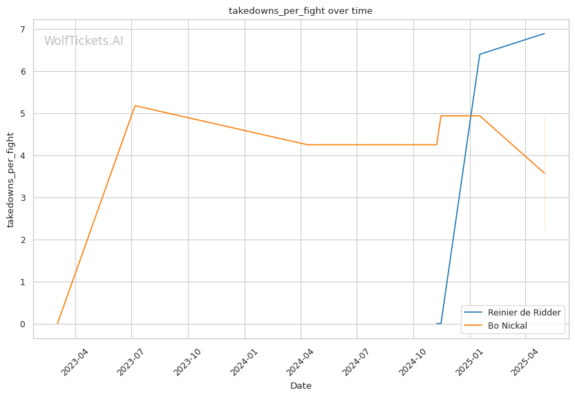 De Ridder's clinch work is distinctive, manufacturing tie-ups to create collar ties and overhooks, but this approach leaves him vulnerable to getting hit during exchanges. His takedown game is solid with nearly 7 takedowns per fight, though his accuracy sits at 46.7%.