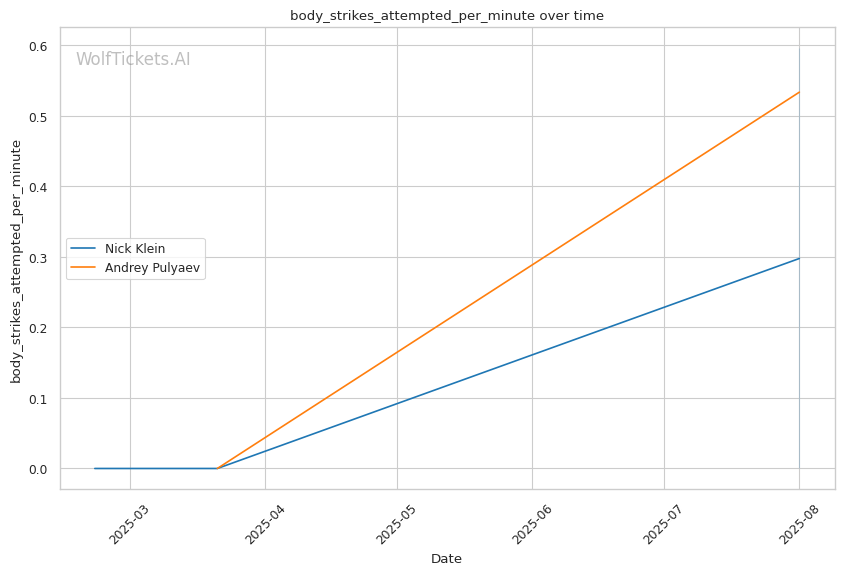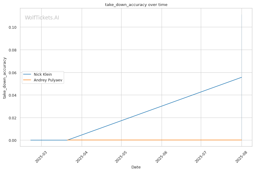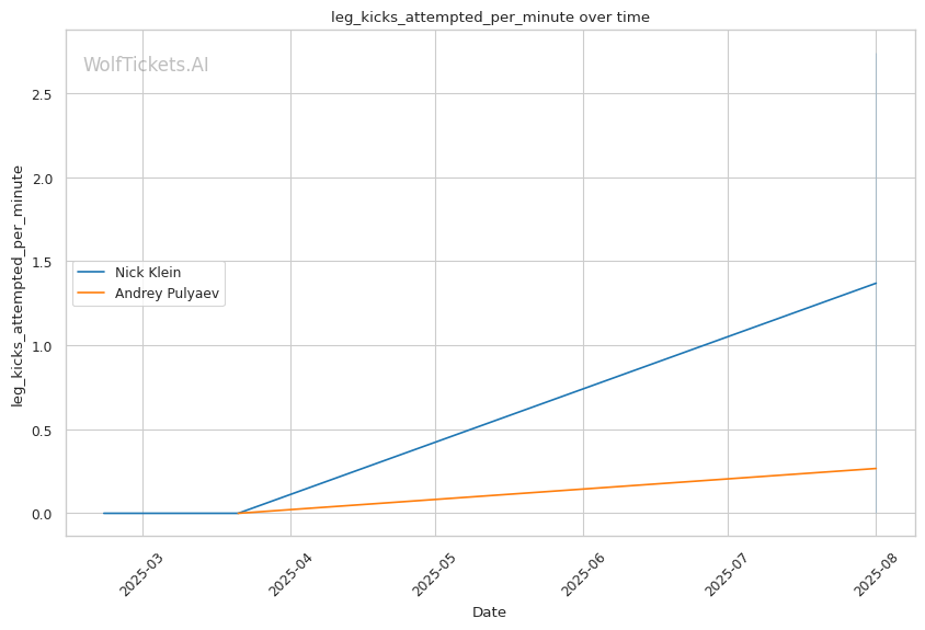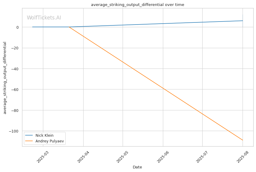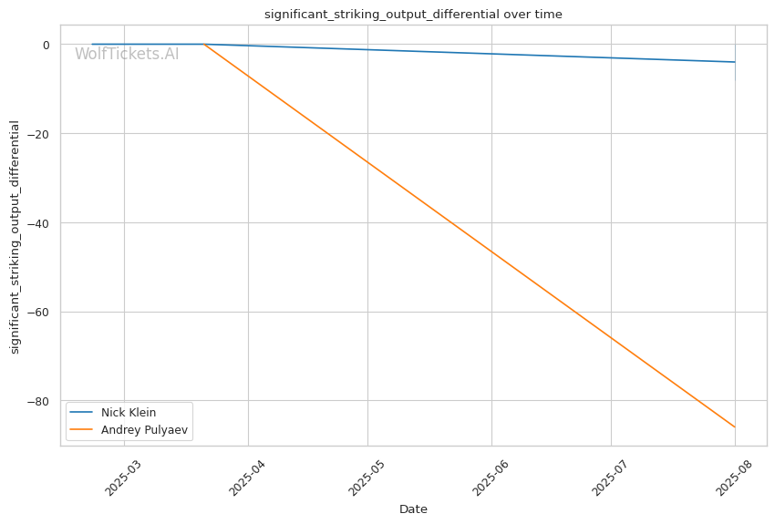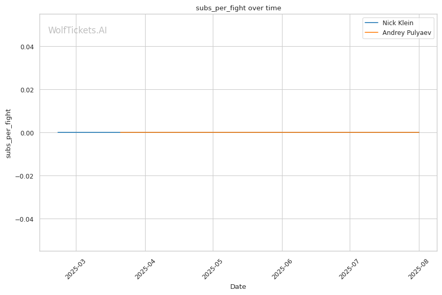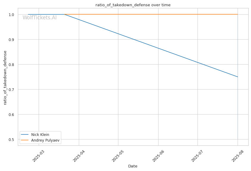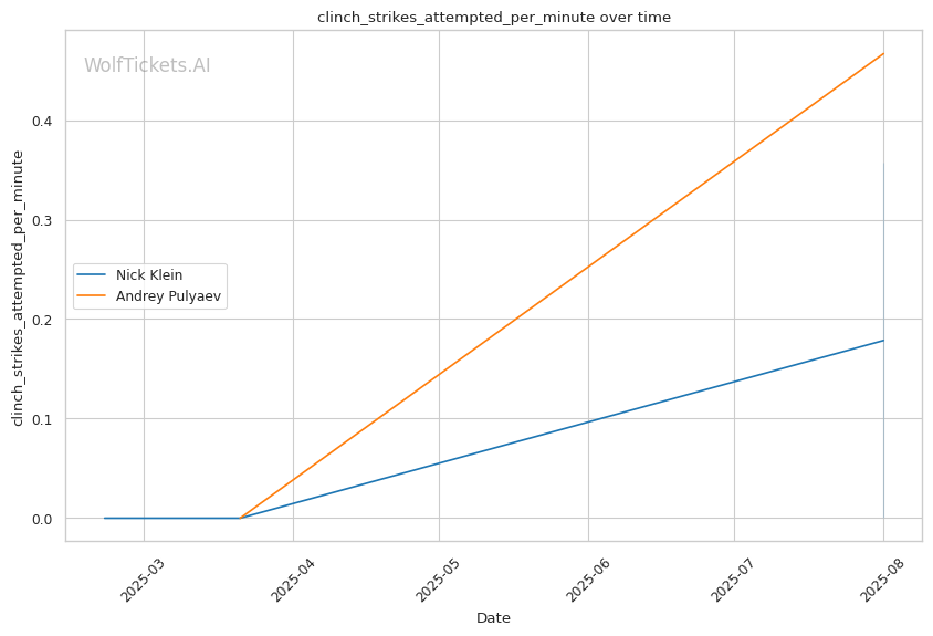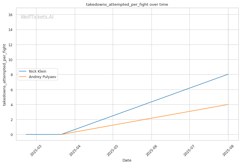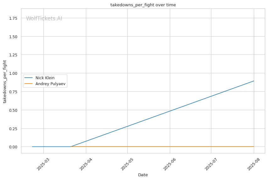 • Klein's pressure targets Pulyaev's weakness: Forward aggression directly exploits Pulyaev's slow defensive footwork • Power vs. technique clash: Klein's explosive bursts could disrupt Pulyaev's technical game plan • Takedown volume advantage: Klein's 16 attempts per fight vs. Pulyaev's 4 suggests scramble comfort • Recent form concerns: Pulyaev's submission loss shows defensive vulnerabilities under pressure