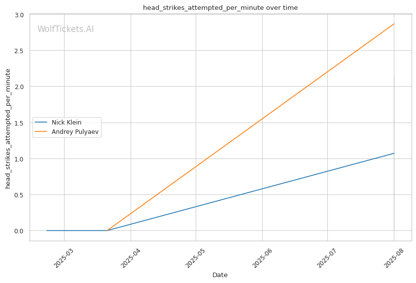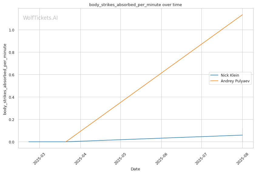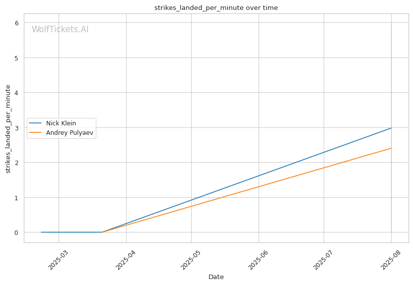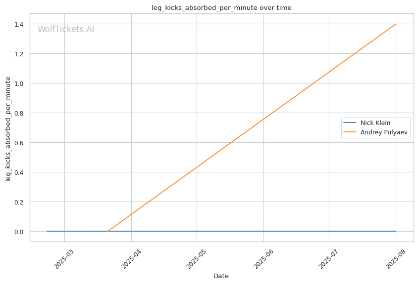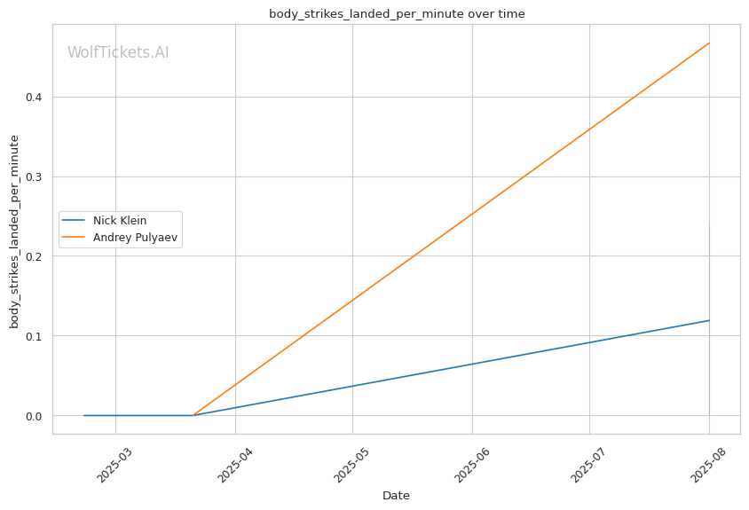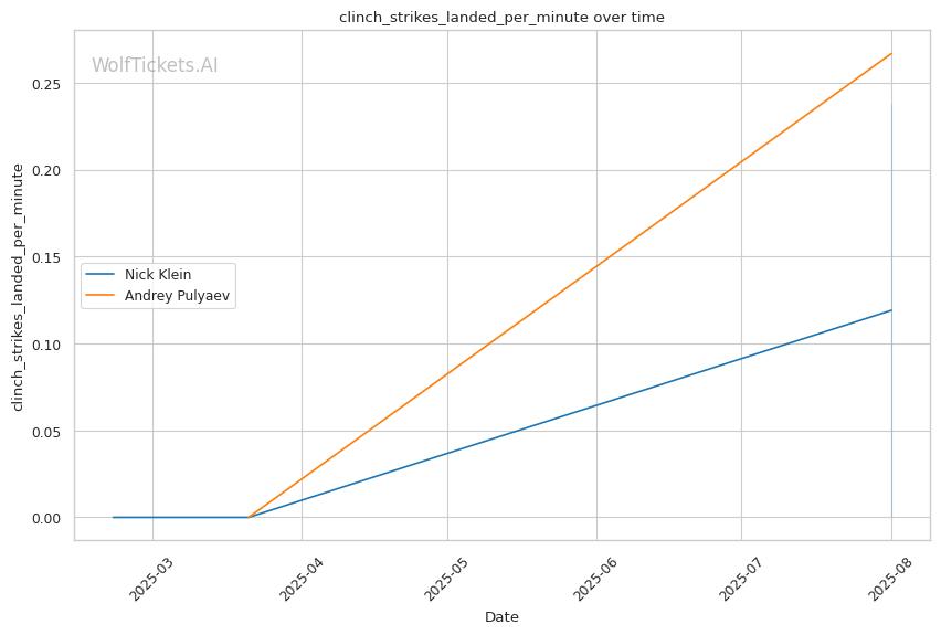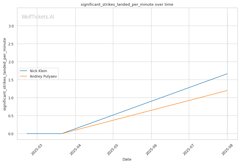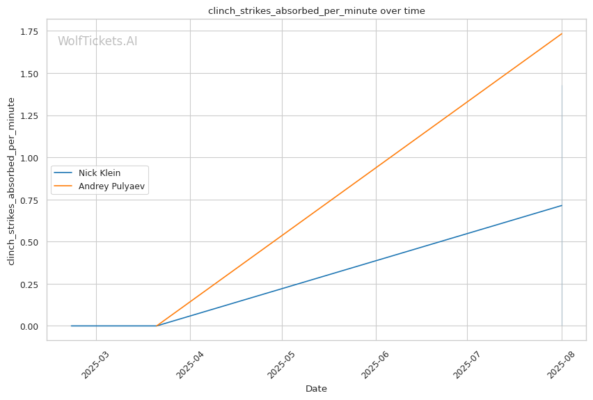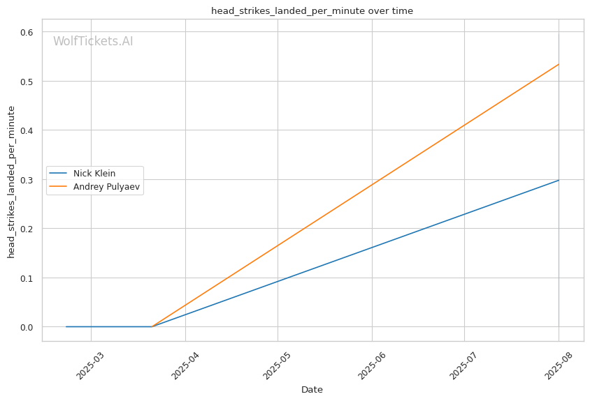 If the fight reaches championship rounds, Klein's aggressive style and higher output (5.95 strikes landed per minute vs Pulyaev's 2.4) should maintain pressure on Pulyaev's already-compromised defensive systems.