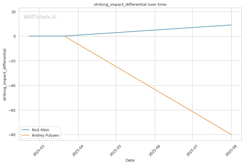 The model heavily favors Klein based on Significant Striking Impact Differential (+8.0) and Striking Impact Differential (+6.0), reflecting Klein's superior power output. Recent Takedowns Attempted per Fight (+4.0) supports Klein's wrestling pressure advantage, while Recent Win Percentage (+2.0) factors in both fighters' 75% win rates with Klein's more recent activity. The Odds (-3.0) slightly penalize Klein as the betting underdog, but the striking metrics overwhelmingly support his aggressive approach against Pulyaev's defensive limitations.
