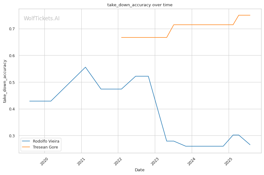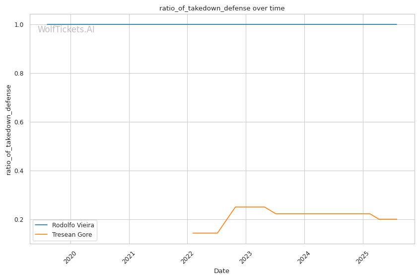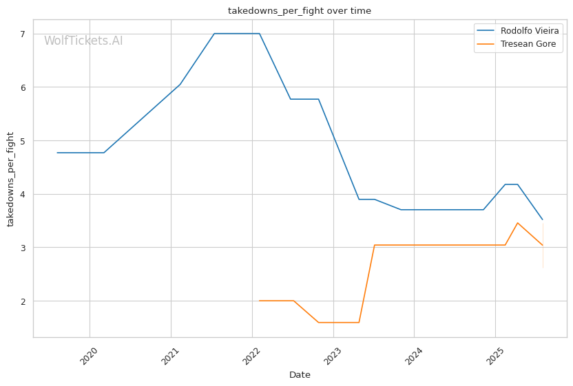 This matchup heavily favors Vieira's technical grappling over Gore's explosive but less refined approach. Gore's tendency to shell up against the cage plays directly into Vieira's preferred control positions—Vieira excels at maintaining pressure against the fence while setting up his signature body lock takedowns. When Gore attempts his single-to-double leg transitions, Vieira's perfect takedown defense ratio (1.0000) suggests he'll effectively counter with underhooks and positional reversals.