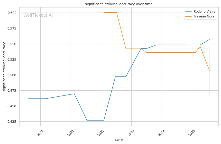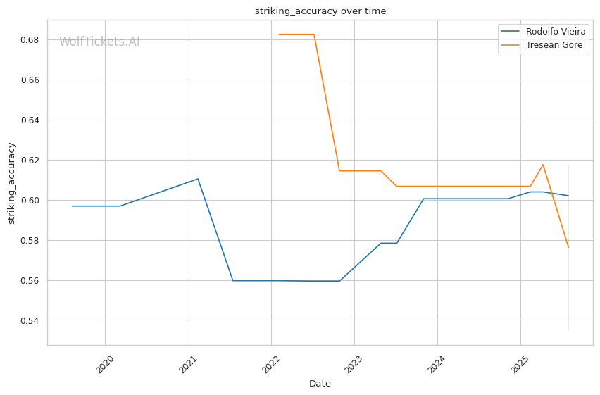 WolfTicketsAI shows mixed recent performance on Vieira, correctly predicting his submission victories over Petrosyan and Brundage but missing his decision loss to Petroski. For Gore, the model correctly predicted his submission win over Trocoli but missed his knockout loss to Tulio. This suggests the model recognizes both fighters' submission capabilities but may underestimate knockout vulnerabilities.