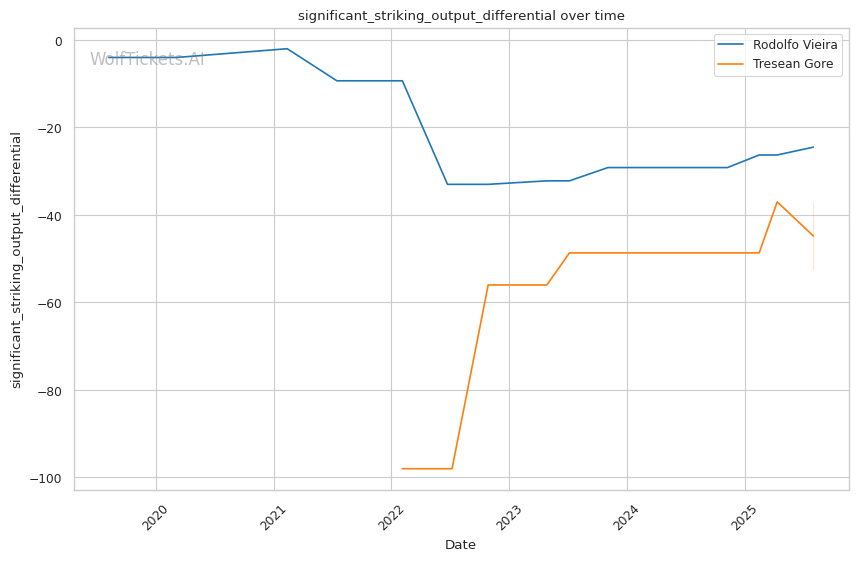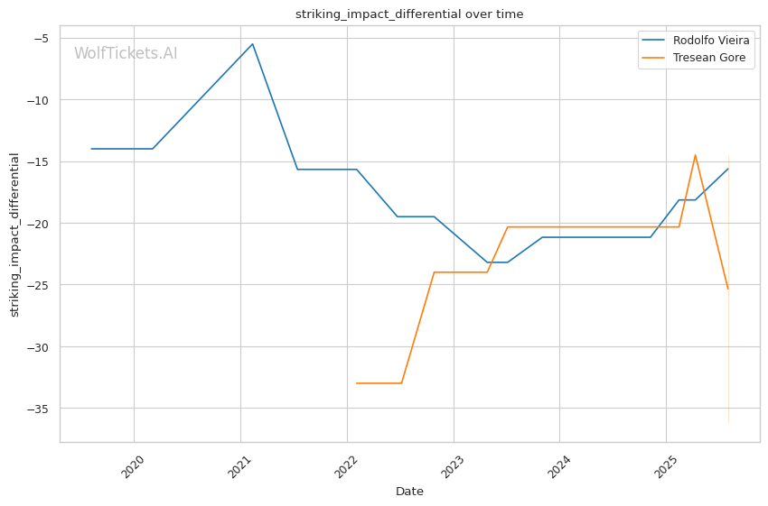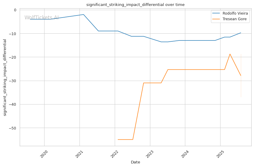 The model's confidence stems from several key statistical advantages favoring Vieira. Odds increased the prediction score by 10 points, reflecting Vieira's significant betting favorite status. Significant Striking Impact Differential added 7 points, highlighting Vieira's superior striking efficiency despite being primarily a grappler. Recent Takedowns Attempted per Fight contributed 4 points, emphasizing Vieira's relentless grappling pressure that Gore's 20% takedown defense cannot withstand.