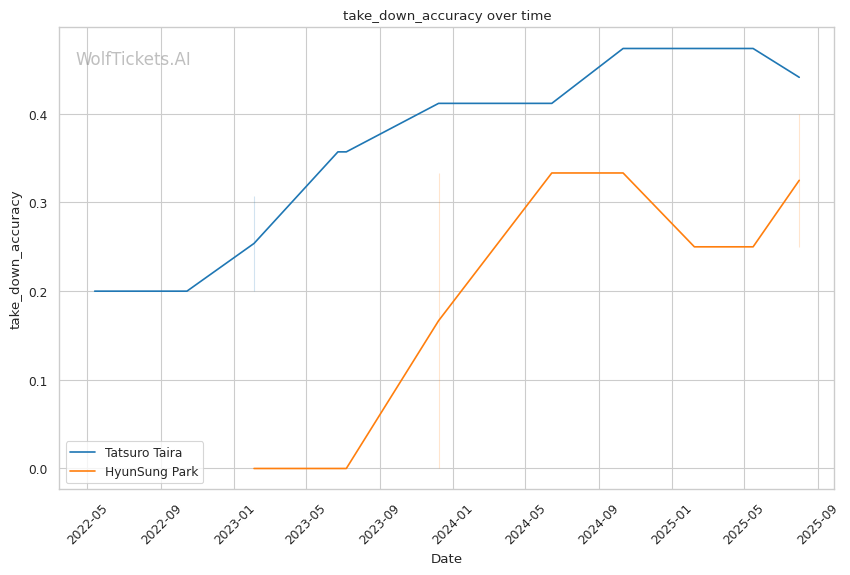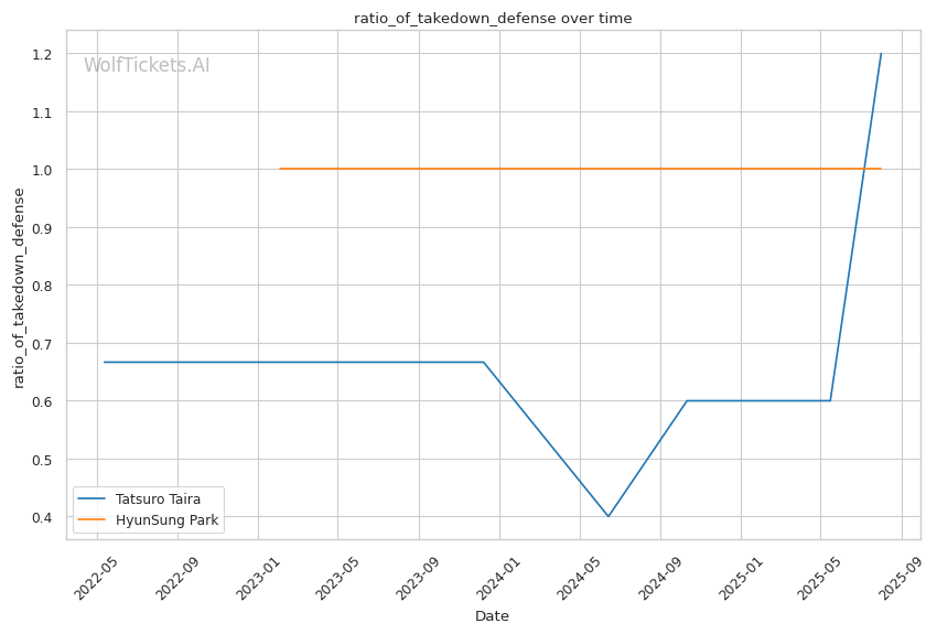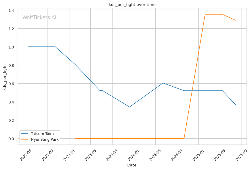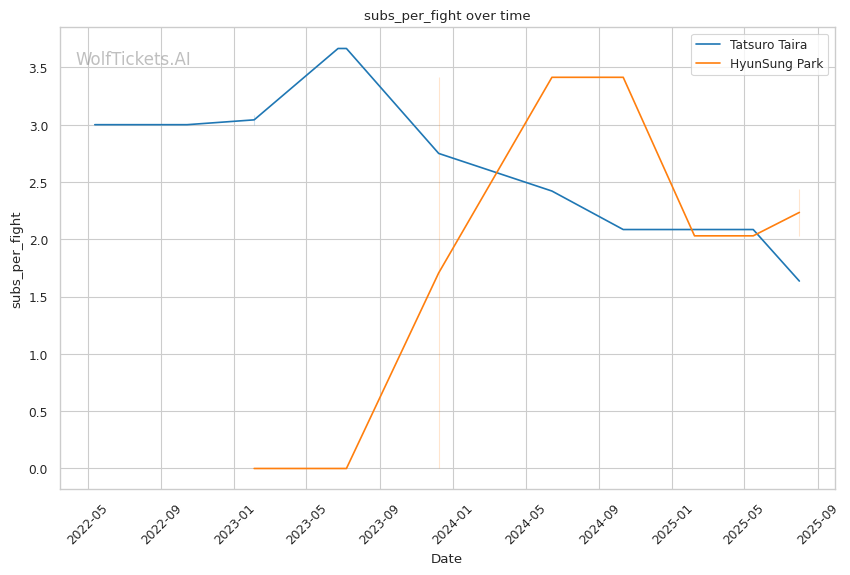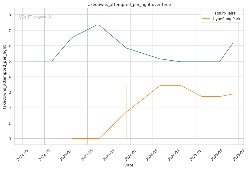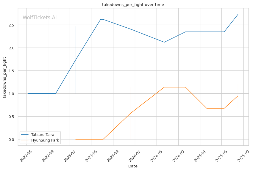 Taira's recent performances show improved striking integration, but his 44% striking defense suggests vulnerability to volume strikers. His takedown rate of 2.7 per fight with 44% accuracy demonstrates solid wrestling, though he prefers opportunistic entries through clinch situations rather than traditional shots.