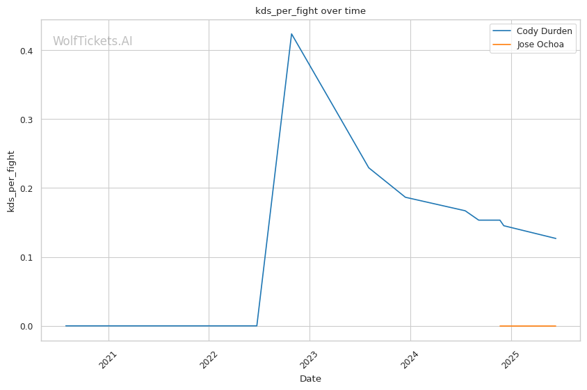 Jose Ochoa presents a challenging stylistic matchup for Cody Durden. While Durden's wrestling pressure will be dangerous early, his technical vulnerabilities in head positioning during takedowns and tendency to fade in later rounds create opportunities for Ochoa. The Peruvian striker's distance management, lateral movement, and counterstriking ability should allow him to avoid Durden's takedowns and capitalize on openings as the fight progresses. Look for Ochoa to weather the early storm before taking over in the later rounds to secure a victory.