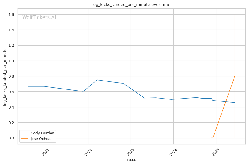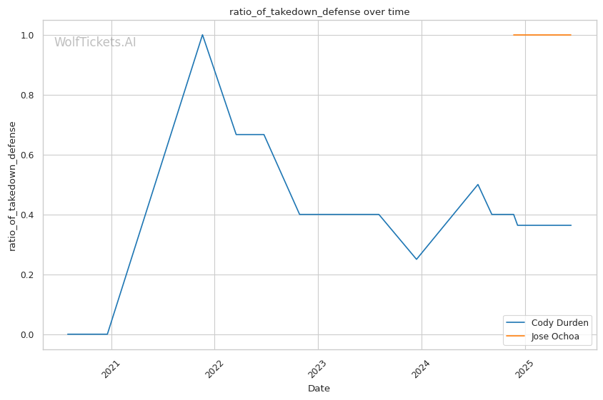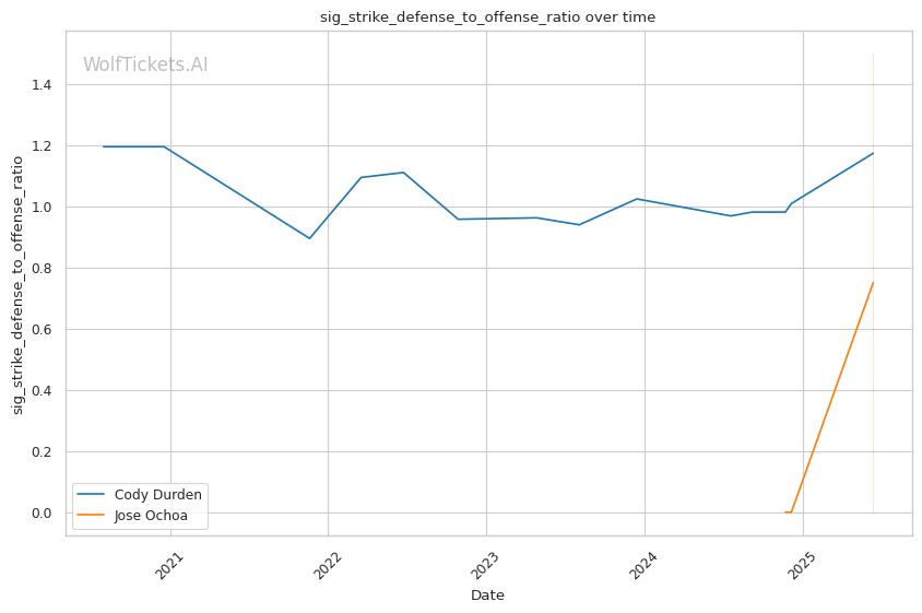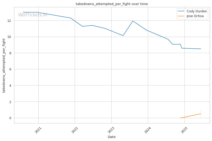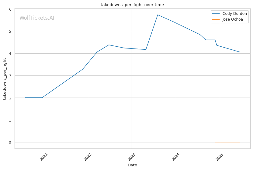 Championship Rounds: Durden's cardio tends to fade, as seen in his fight with Charles Johnson where his takedown attempts became less explosive in round 3. If Ochoa can force a striking match into the later rounds, his technical boxing and fresher gas tank could give him a significant advantage.