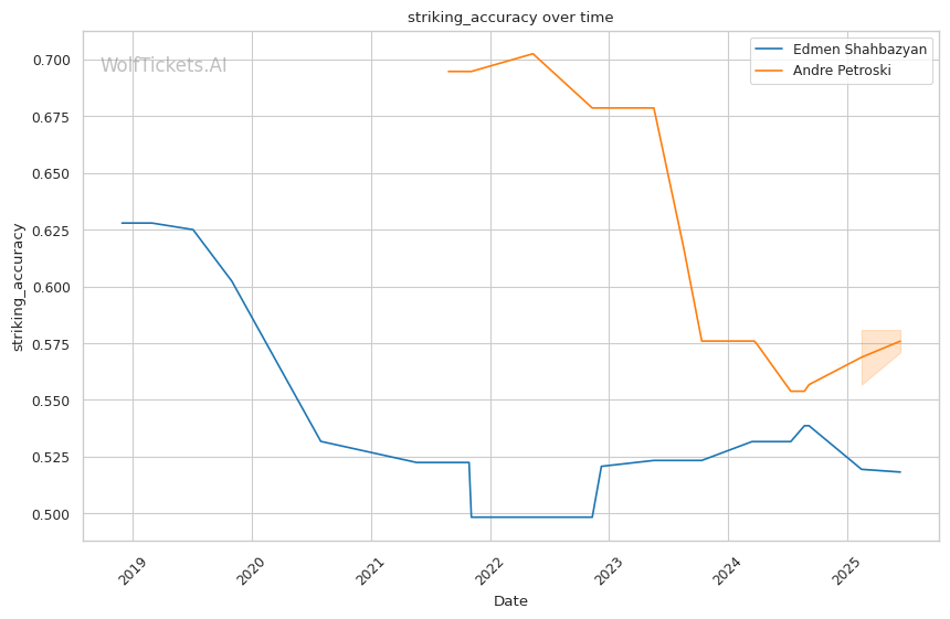 For Petroski, WolfTicketsAI has been less consistent, correctly predicting only three of his last seven fights. The model has struggled particularly with Petroski's wrestling-based victories, incorrectly predicting losses against Wellington Turman and Nick Maximov. This suggests some caution regarding the model's evaluation of grappling-heavy fighters like Petroski.