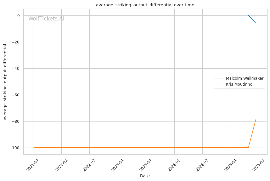 The reach advantage (71" vs 68") further benefits Wellmaker, allowing him to establish his jab while staying outside Moutinho's preferred range. This dynamic mirrors Moutinho's fight with O'Malley, where the reach disadvantage prevented him from landing effectively while absorbing significant damage.
