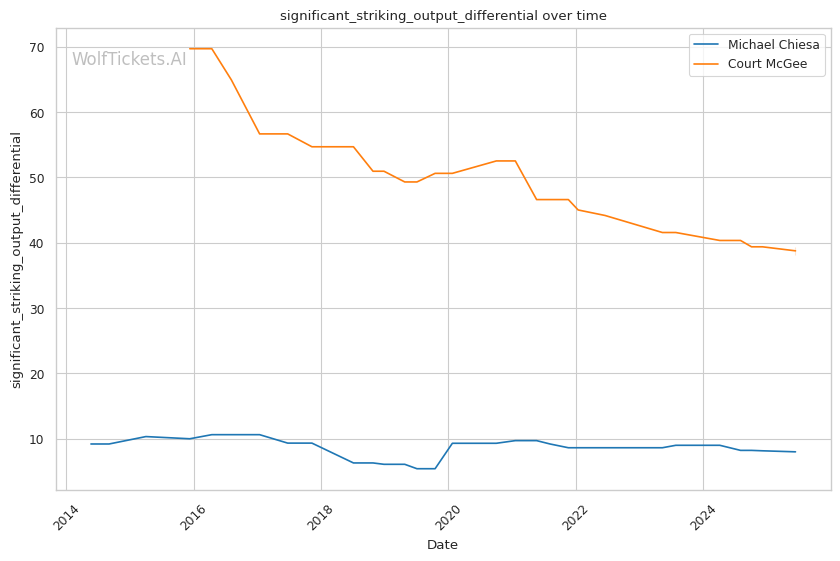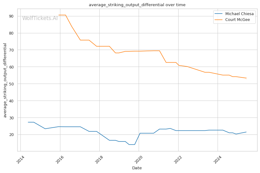 Striking exchanges favor Chiesa: While neither fighter is known for knockout power, Chiesa's improved striking and use of oblique kicks should allow him to manage distance more effectively than McGee's predictable boxing combinations.
